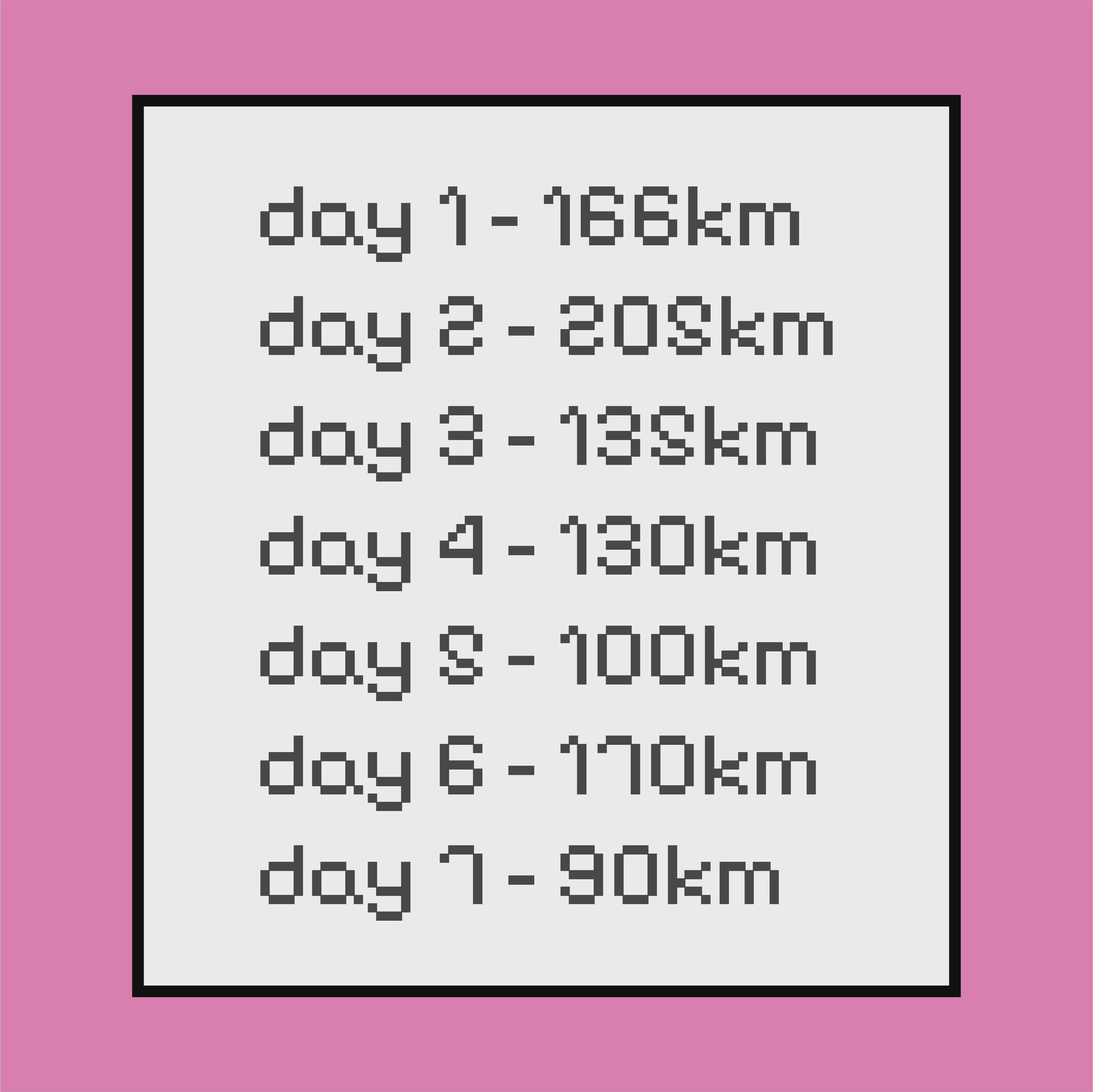 This is a rough example of the route we will be taking. We will update this when the accommodation and routes have been finalised.
